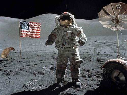 “That’s one small step for man. One giant leap for…hold it! What’s that dog doing in the picture? Never mind. I can see what he’s doing.”