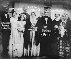 This is likely a Sunday afternoon, post-church daguerreotype of then Secretary of State and future 15th President James Buchanan (on left), his niece Harriet Lane, First Lady Sarah Childress Polk and our 11th President James Knox Polk (in center) and former First Lady and revered national matriarch Dolley Madison (2nd from left – she moved during the long exposure time). They are all dressed in their Sunday finery or possibly before a state dinner or diplomatic reception.